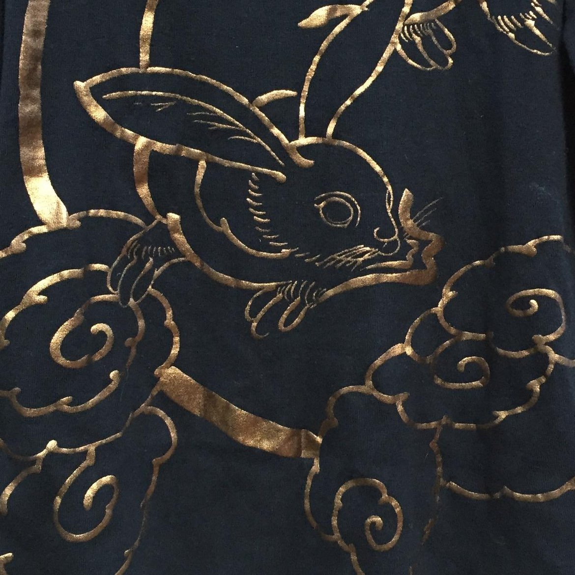 Custo Barcelona! Featuring metallic copper rabbits on a black backround, with multicolor flames on the back (the sleeves are asymmetric--flames on the left, rabbits on the right). The flames are matte red/metallic blue & dark gold. 100% cotton. Marked designer size 1, fits like S/M. In good condition with minor wear--some fading to the intensity of the flame print's color.