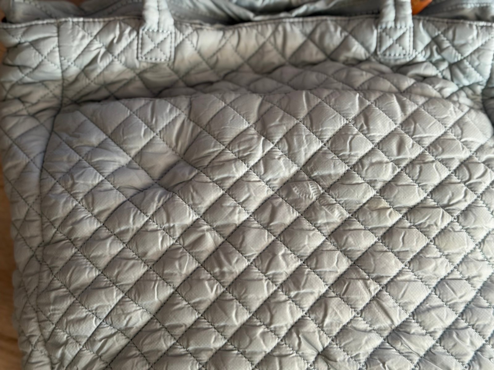 There’s a stain on the front pocket which is not visible when closed. See last 2 pics. There is also some light stains on back of bag. See pics.