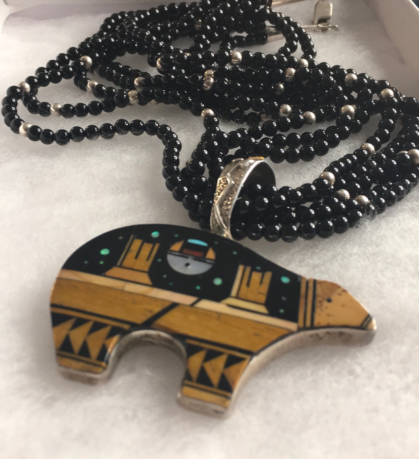 Beautiful Native American beaded handmade necklace. Solid piece of sterling silver not marked from what I can see but out of same collection and tested. I miss placed the sticker for this one but I believe it’s made by the same artist as the other bear in my collection as well . Beautiful inlay has stones of onyx and mother-of-pearl and opal. Beautiful black Native American beads. Shiny, brilliant, gorgeously reversible Bear. Handmade. Tells a story. 110 grams total weight of necklace. Pictures don’t do it justice. It’s one of a kind. Marked sterling on both end pieces. Beautiful craftsmanship. THE ENTIRE NECKLACE IS MULTI LAYER ONYX STONES.
