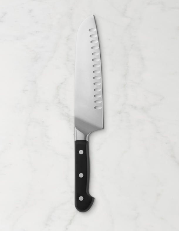This hollow-ground santoku knife excels for precision chopping, slicing and mincing of meat, fish and vegetables. A special curved bolster design by architect Matteo Thun promotes a perfect professional grip for comfort and safety, and allows both Western rocking cuts and Asian chop cuts.